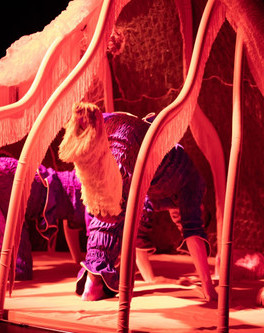 In Himstregimser og andre duppeditter (Odds and Ends and Other Thingamajigs), children are invited into a world of shapes, textures, sound, and movement. The space is filled with imaginative and curious textile objects, each with countless functions, engaging a variety of senses. There are trees made of hats and giant bead necklaces, and we meet two strange, dancing creatures who live there. In this performance, nothing needs to be understood or interpreted, and there are no stories to follow. The boundaries between adults, children, dancers, and audience blur, and it’s perfectly fine to touch and explore the soft textile objects.